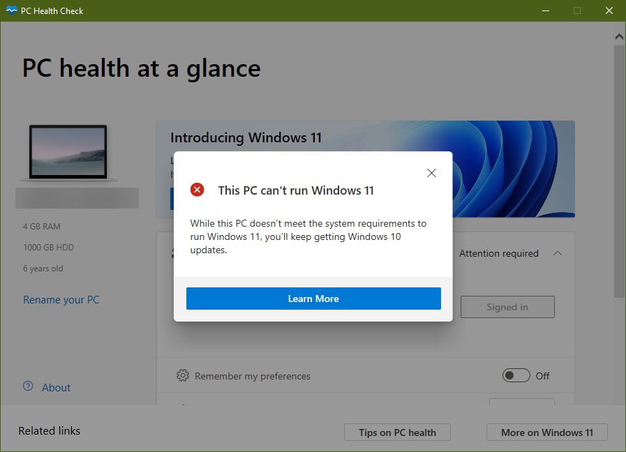 Follow-up to my TwitLonger statement: "I doubt Windows 11 will even install on my main laptop at all" The response is no according to the PC Health Check tool.