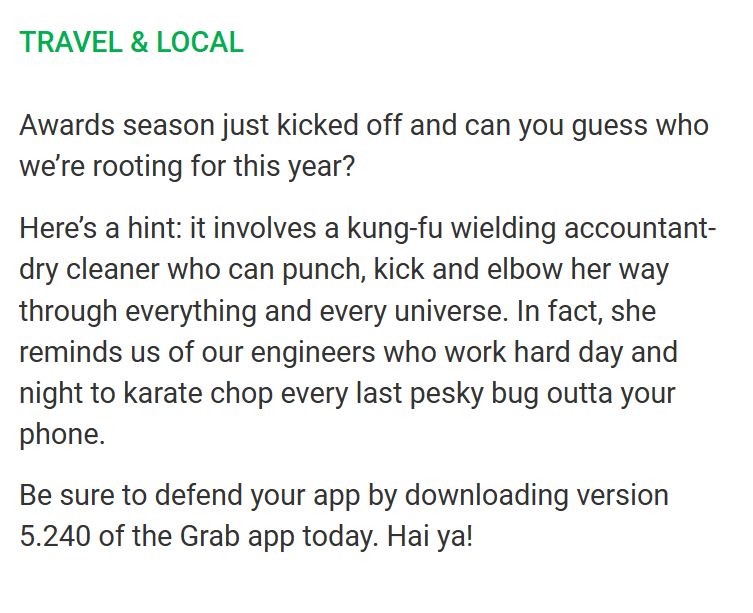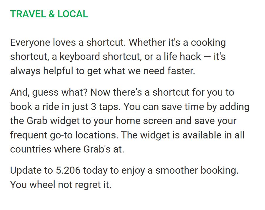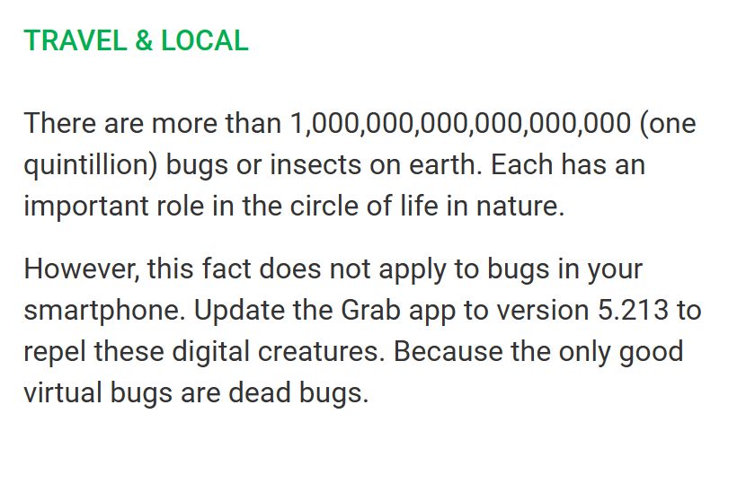 Some more Grab changelogs. Some actual effort put complete with some sort of humor, unlike most apps with their generic "bug fixes and performance improvements" changelogs; nice job!